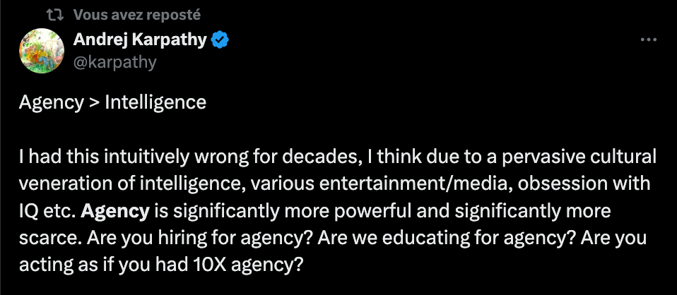 As Andrej Karpathy's tweet goes on to explain (thanks to Grok): "Agency, as a personality trait, refers to an individual's capacity to take initiative, make decisions, and exert control over their actions and environment."
