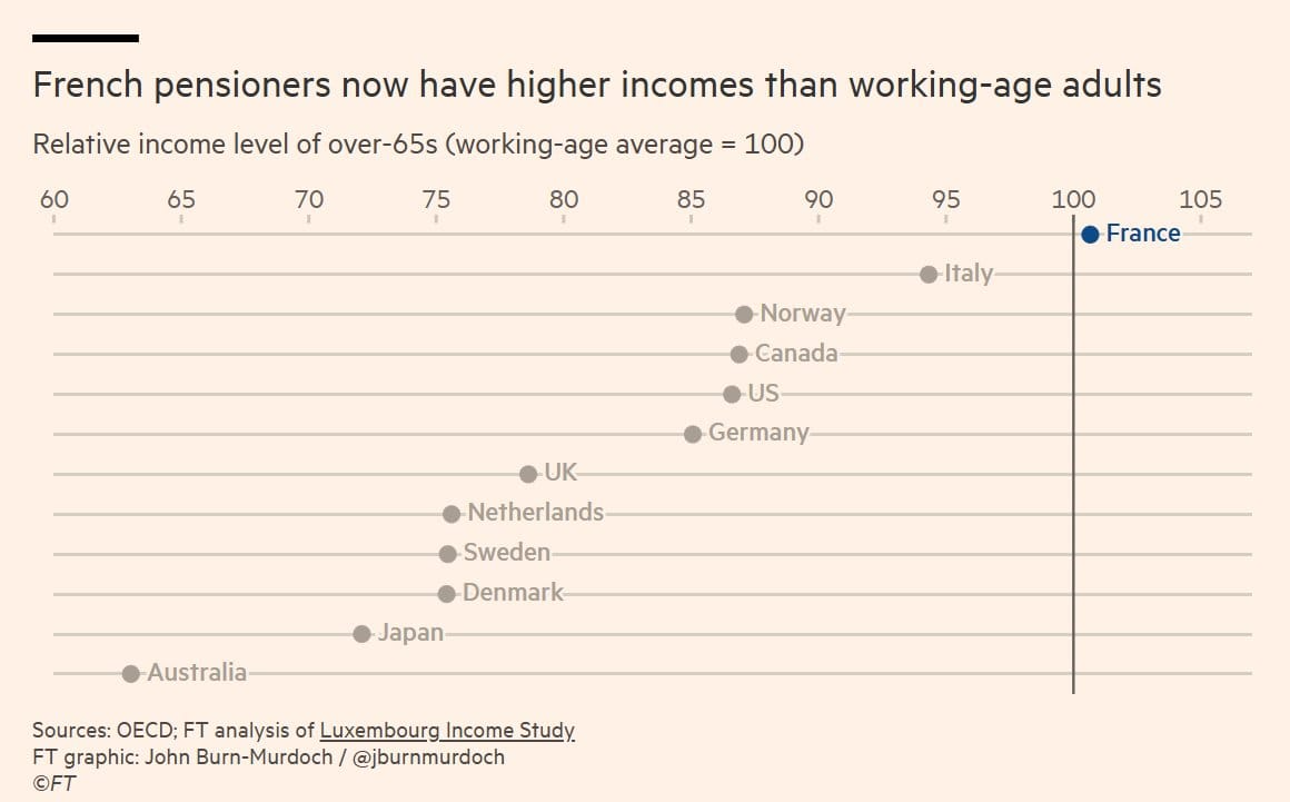 Over the weekend, the Financial Times shared yet another damning visual showing how French pensioners are more wealthy and consume more than the working class. How can you in your right mind defend retirement at 62 (even 60 - caugh caugh Manuel Bompard) when seeing this? The framing is off.