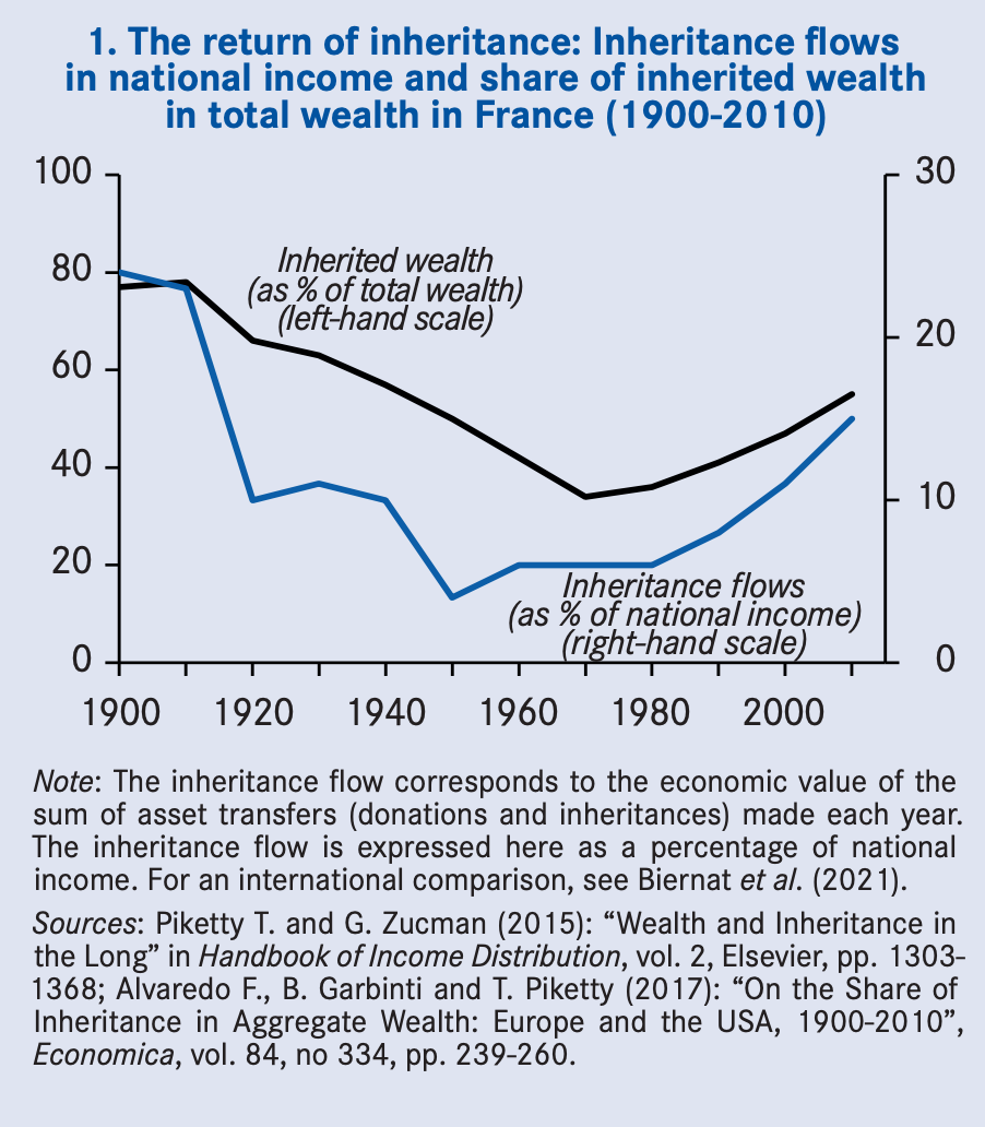 In France, wealth at the top is mainly dynastic, not entrepreneurial. In the early 1970s, inherited wealth was about 35% of France’s total private wealth; today, estimates put it near 60%.